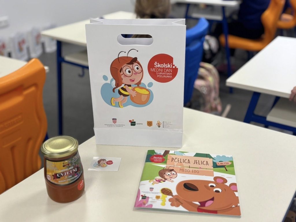 Učenici su dobili prigodnu vrećicu s medom zapakiranim u Nacionalne staklenke za med, brošuru te edukativnu slikovnicu o pčelarstvu “Pčelica Jelica i medo Edo”.