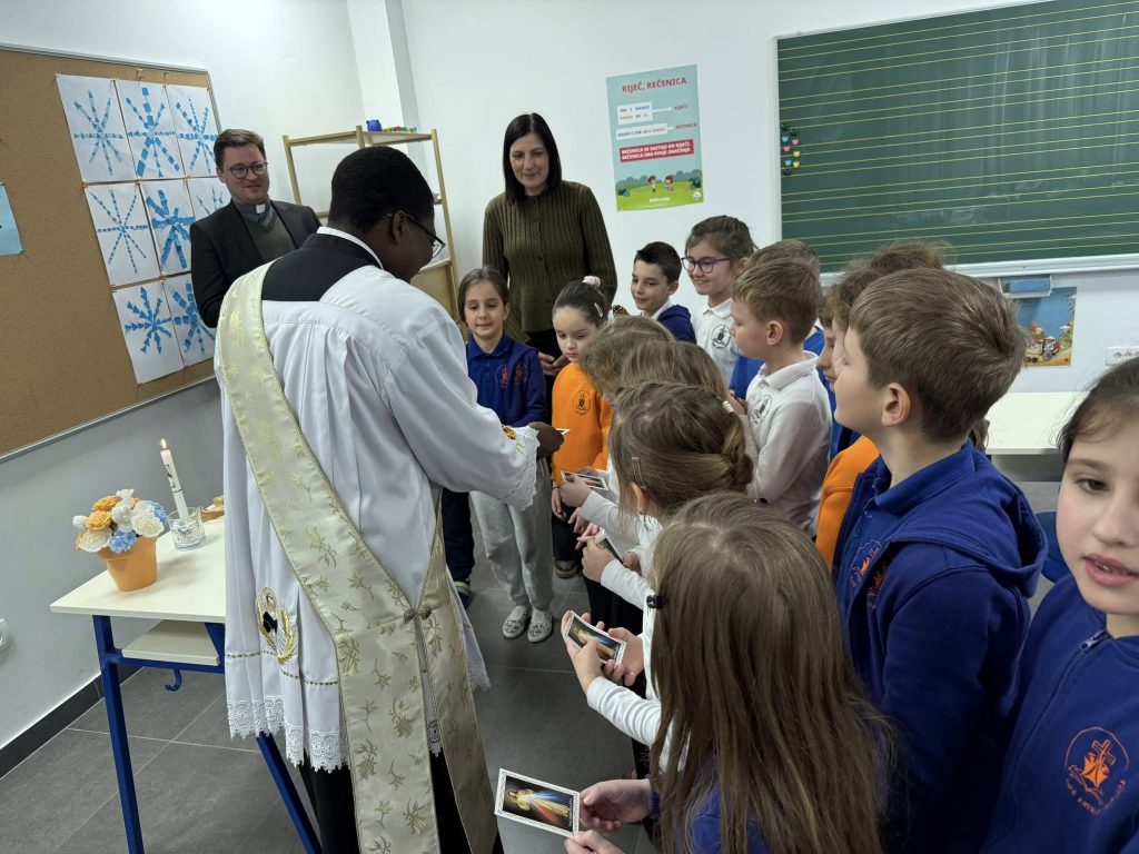 U srijedu, 14. siječnja našu je Školu posjetio vlč. Gutenberg, đakon iz župe Gospe Brze Pomoći, te tom prigodom udijelio blagoslov Školi. Blagoslov je upućen svim učenicima i djelatnicima, s nakanom da im donese mir, snagu i uspjeh u svakodnevnom radu i učenju. Zahvaljujemo vlč. Gutenbergu na posjetu, molitvi i blagoslovu kojim je obogatio život naše Škole.